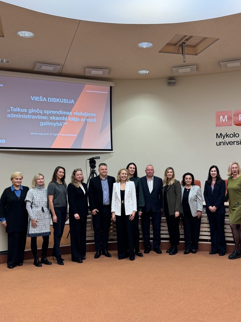 Spalio 14 dieną Mykolo Romerio universitete vyko Mediacijos ir darnaus ginčų sprendimo laboratorijos kartu su Lietuvos mediatorių rūmais organizuota diskusija „Taikus ginčų sprendimas viešajame administravime: skambi idėja ar reali galimybė?“.