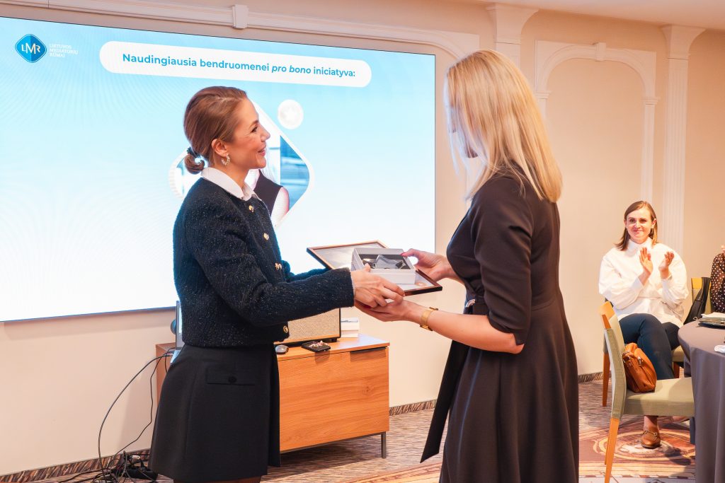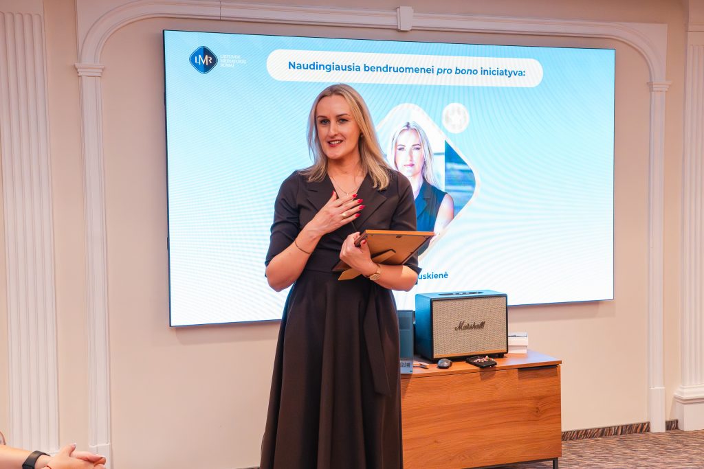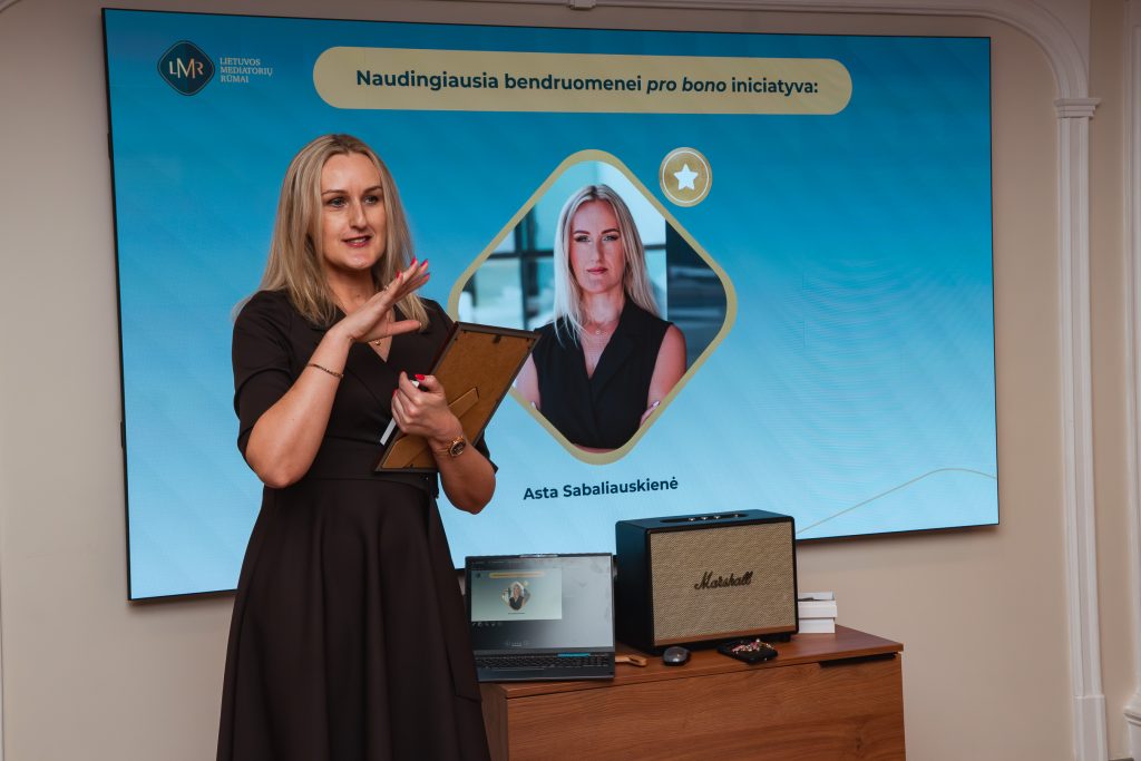 „Naudingiausia bendruomenei pro bono iniciatyva“ išrinkta – Astos Sabaliauskienės organizuojamo LMR Praktikos komiteto veikla. Komiteto darbas išsiskiria aktyvumu, dideliu narių įsitraukimu ir apčiuopiamais rezultatais. Kryptingai telkdama bendruomenę, ji užtikrina sklandų komiteto veikimą ir realią naudą mediatoriams formuojant gerosios praktikos standartus.