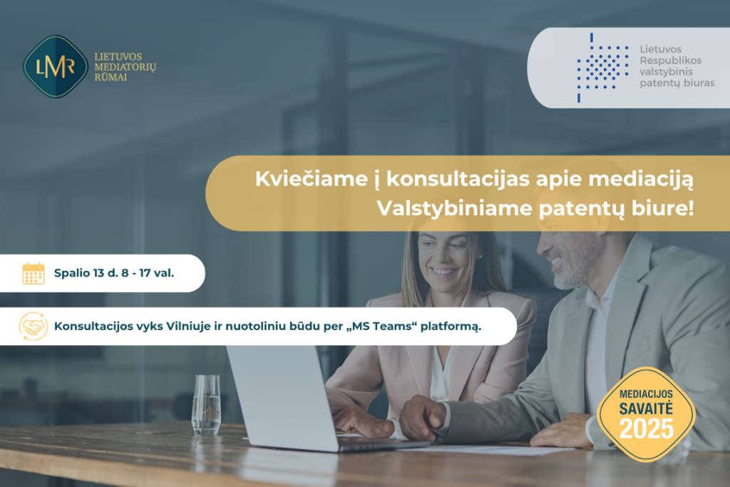 Valstybinis patentų biuras (VPB) jungiasi prie Lietuvos mediatorių rūmų organizuojamos „LMR Mediacijos savaitės 2025“ iniciatyvų ir 2025 m. spalio 13 d. kviečia gyventojus į nemokamas mediacijos konsultacijas. Tai puiki proga iš pirmų lūpų sužinoti kuo neteisminė mediacija gali būti naudinga sprendžiant intelektinės nuosavybės ginčus.