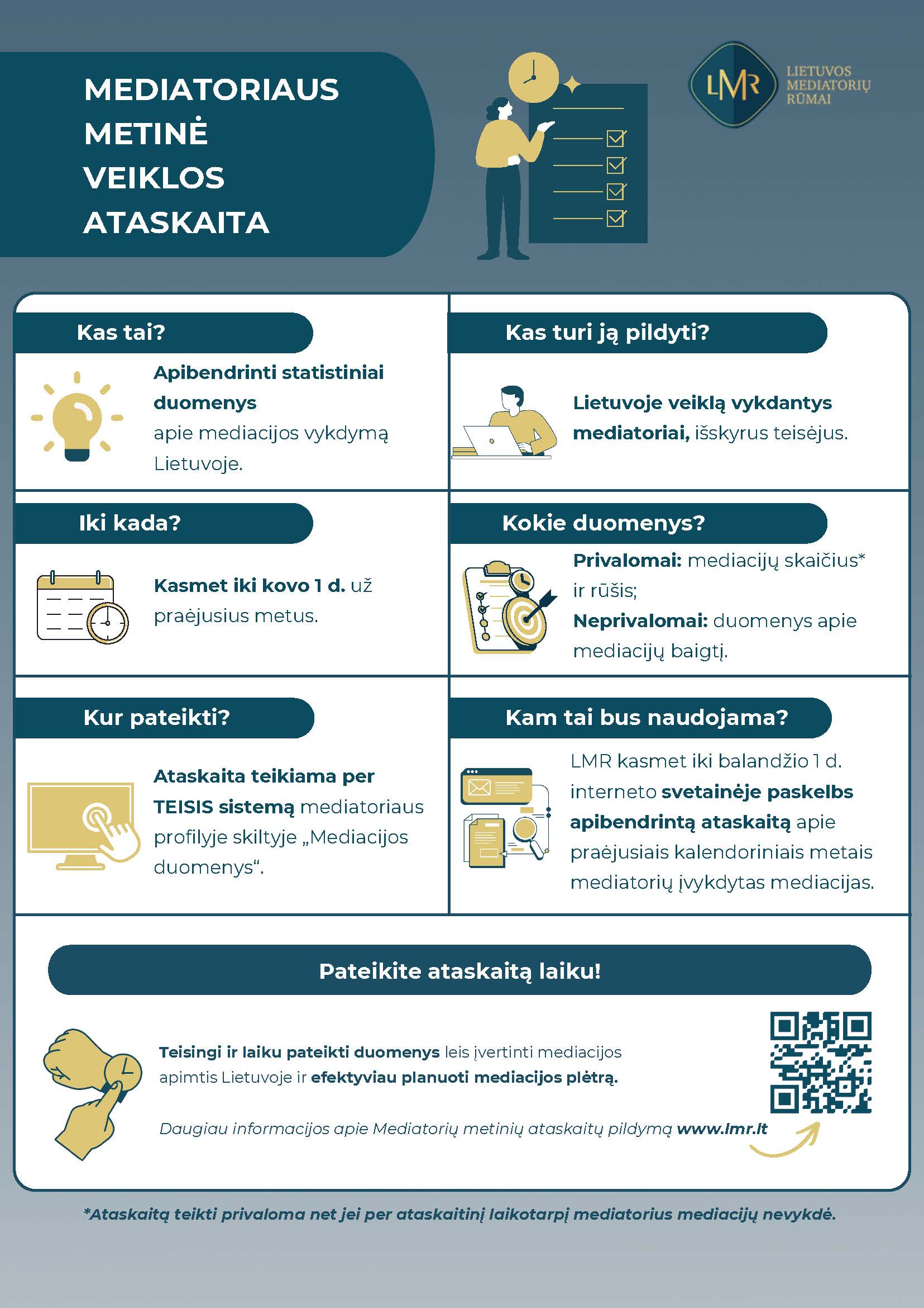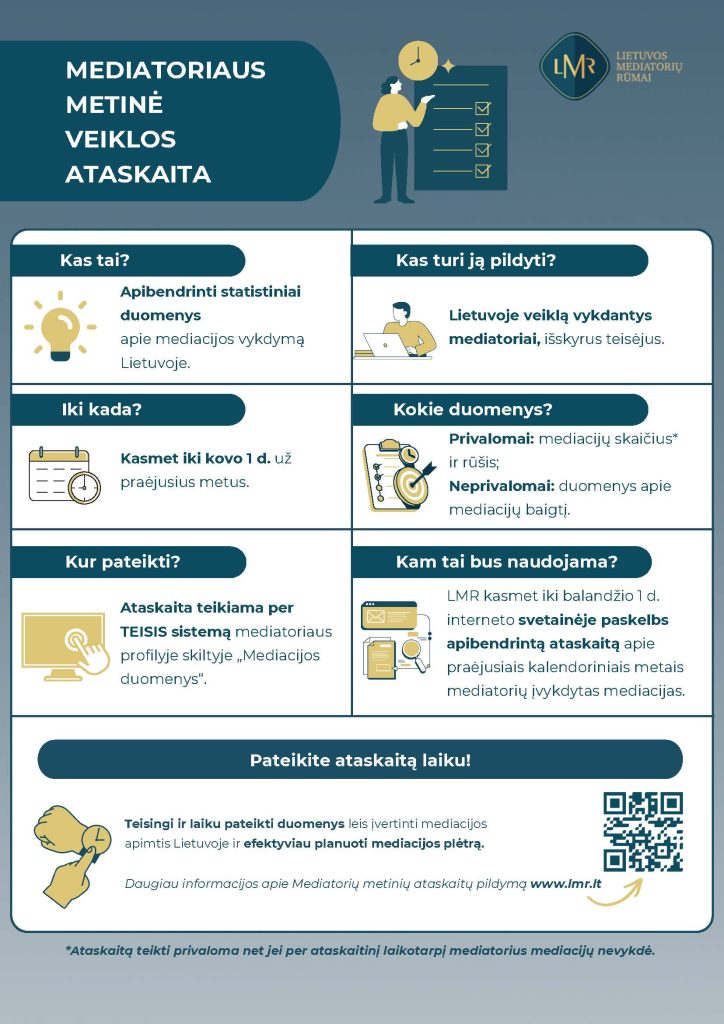 Nuo šių metų įsigalioję pakeitimai numato, kad Lietuvoje veiklą vykdantys mediatoriai, išskyrus teisėjus, kasmet iki kovo 1 d. turi informacinėje sistemoje „Teisis“ pateikti per praėjusius metus vykdytų mediacijų skaičių ir pagal pateiktą klasifikatorių nurodyti jų rūšį. Papildomai mediatoriai gali pateikti ir informaciją apie šių mediacijų baigtį. Ataskaitą teikti privaloma net jei per ataskaitinį laikotarpį mediatorius paslaugų neteikė. LMR yra atsakingi už šių ataskaitų tvarkymą ir savalaikį viešą jų apibendrintų duomenų paskelbimą. Kasmet iki balandžio 1 dienos Lietuvos mediatorių rūmai savo interneto svetainėje skelbs apibendrintą ataskaitą apie praėjusiais kalendoriniais metais mediatorių įvykdytas mediacijas.