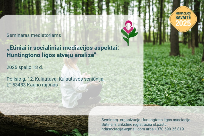 Huntingtono ligos asociacija kartu su Lietuvos mediatorių rūmais kviečia mediatorius ir kitus ginčų sprendimo specialistus į seminarą „Etiniai ir socialiniai mediacijos aspektai: Huntingtono ligos atvejų analizė“, kuris vyks 2025 m. spalio 13 d. Poilsio g. 12, Kulautuvoje, Kauno rajone.