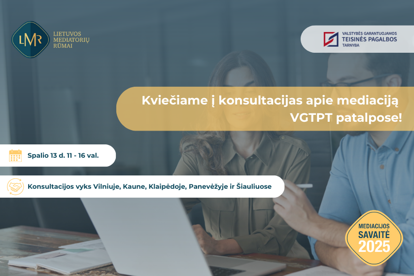 Valstybės garantuojamos teisinės pagalbos tarnyba jungiasi prie Lietuvos mediatorių rūmų organizuojamos „LMR Mediacijos savaitės 2025“ iniciatyvų ir 2025 m. spalio 13 d. kviečia gyventojus į nemokamas gyvas mediacijos konsultacijas. Tai puiki proga iš pirmų lūpų sužinoti, kas yra mediacija, kaip ji veikia ir kodėl vis daugiau žmonių renkasi šį būdą ginčams spręsti. Dažnai apie mediaciją girdime tik kaip apie alternatyvą teismui, tačiau iš tiesų ji atveria ir daugiau galimybių ginčo šalims – suteikia progą konstruktyviai kalbėtis, ieškoti ir rasti abi puses tenkinantį sprendimą ir jei tai aktualu, atkurti tarpusavio pasitikėjimą.