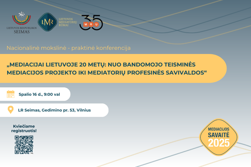 Kasmet trečiąjį spalio mėn. trečiadienį daugelyje pasaulio valstybių minima Tarptautinė mediacijos diena. Šiemet Tarptautinės mediacijos dienos proga Lietuvos mediatorių rūmai (LMR) kartu su Seimo teisės ir teisėtvarkos komitetu bei akademiniu partneriu Mykolo Romerio universitetu (MRU) spalio 16 d., ketvirtadienį, 9 val. Seimo Konferencijų salėje (III r.) organizuoja nacionalinę mokslinę-praktinę konferenciją „Mediacijai Lietuvoje 20 metų: nuo bandomojo teisminės mediacijos projekto iki mediatorių profesinės savivaldos“.